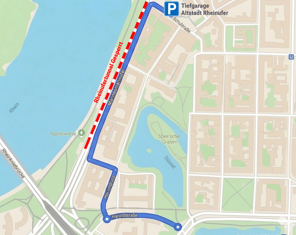 Hinweis: Aufgrund der temporären Sperrung des Rheinufertunnels ist die gewohnte Ein- und Ausfahrt im Zeitraum 30.03., 05:00 Uhr bis 25.04., 18:00 Uhr nicht möglich. Die Zu- und Ausfahrt erfolgt in dieser Zeit ausschließlich über die Schulstraße, erreichbar über das Mannesmannufer – Zufahrtsskizze öffnen.